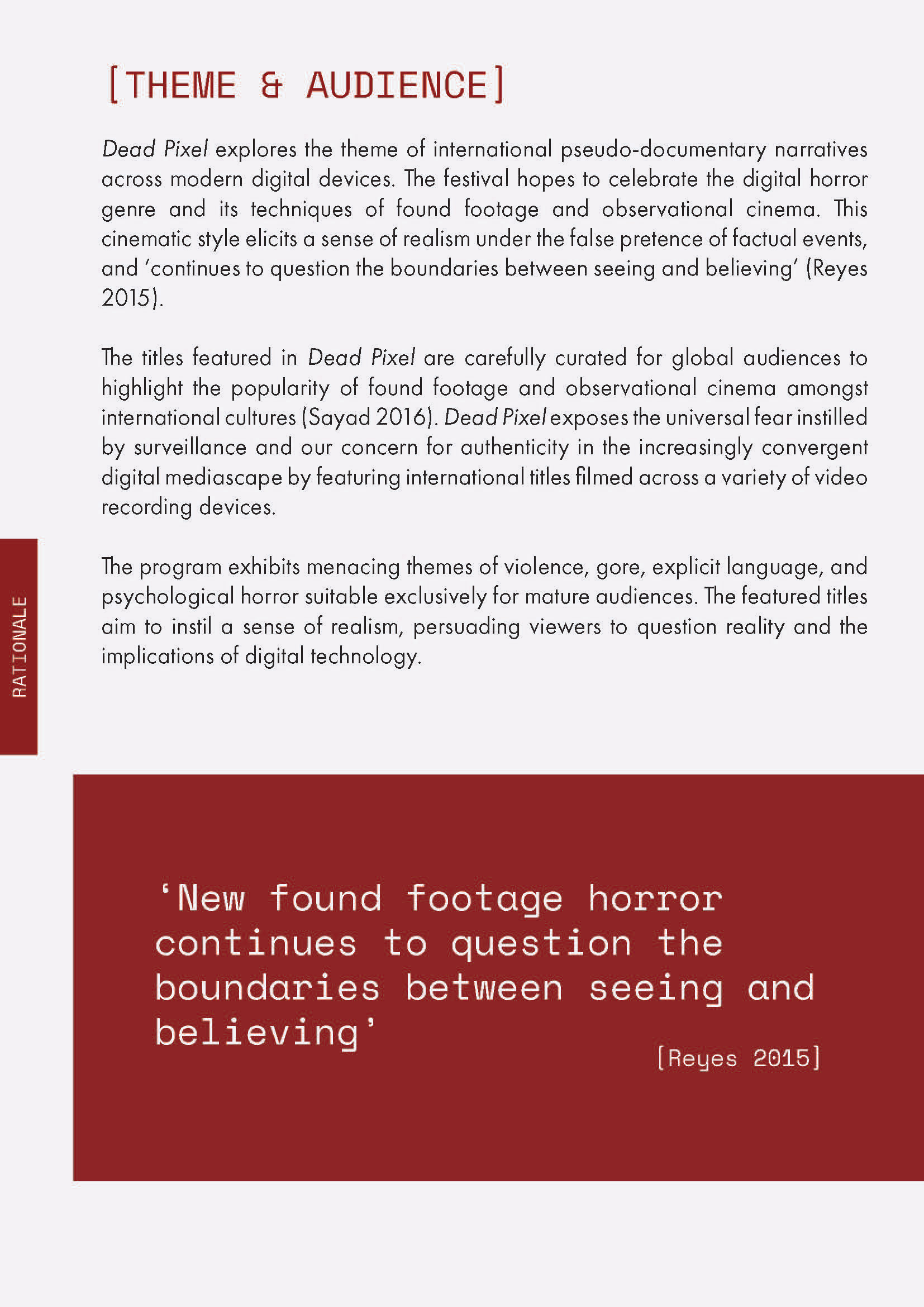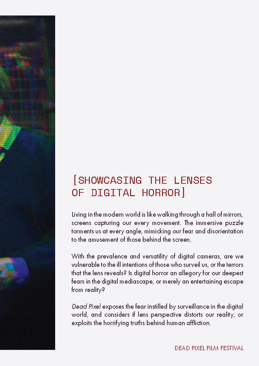 Dead Pixel is a fictitious film festival created as a passion project and university portfolio submission. Below is a mockup of the Dead Pixel Film Festival print version. All image edits, copywriting, and layout design are original works.